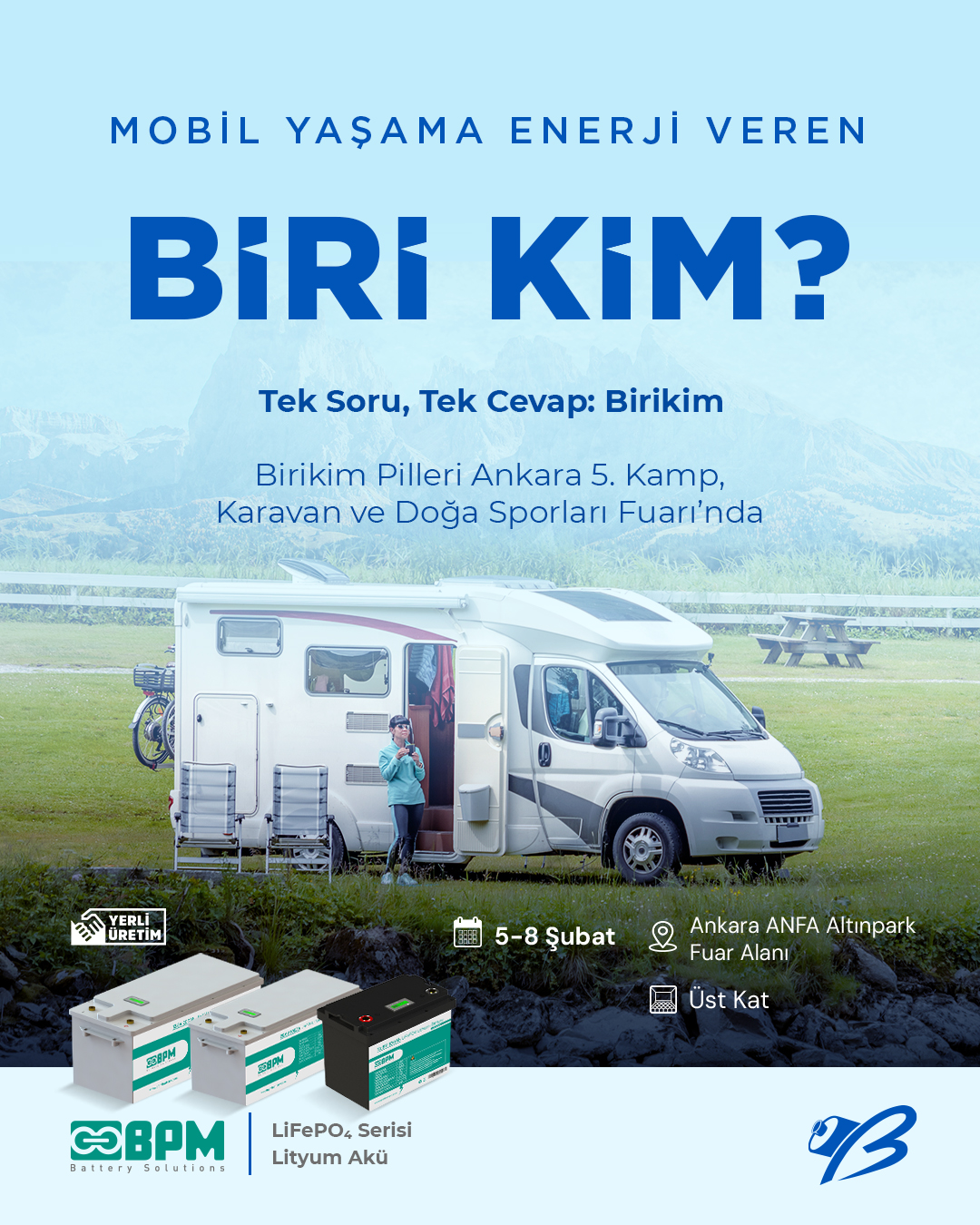 Mobil yaşamda konforu ve özgürlüğü artıran LiFePO₄ akü çözümlerimizi yakından incelemek ve uzman ekibimizle birebir görüşmek için 5–8 Şubat tarihleri arasında Ankara ANFA Altınpark Fuar Alanı’nda düzenlenecek 5. Kamp, Karavan ve Doğa Sporları Fuarı’nda, üst katta yer alan standımıza sizleri bekliyoruz.